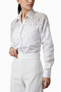 Featuring the White Heavy Encrusted Pearl Swarovski Shirt from Pallavi Swadi. This shirt offers a boxy fit, classic collar, and concealed button placket, coupled with full sleeves. Adorned with lavish embellishments on the collar, shoulders, and sleeves, it radiates opulence and sophistication.