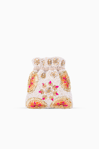 Featuring the White Herakles Handbag by 5 Elements by Radhika Gupta. Elevate your style with sophistication. Adorned with intricate white stone embroidery, this stunning handbag seamlessly blends elegance and simplicity, perfect for any occasion. Embrace timeless sophistication with this beautifully crafted accessory that complements your fashion sense effortlessly.