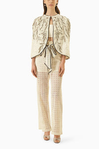 Featuring Ilham Jacket, Trousers And Bralette Set. The Jacket Is Adorned With Intricate Beads In Shades Of Silver And White Hand Embroidery.