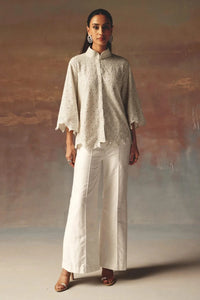 Featuring a high-neck scallop jacket embellished with intricate mirrorwork and beadwork. Paired with Dupion bellbottoms, it strikes the perfect balance between tradition and modern sophistication.