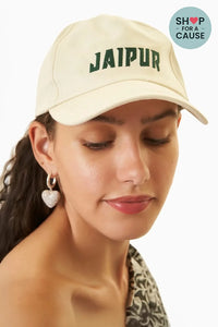 Featuring the White Jaipur Embroidered Cap, showcasing eye-catching typography embroidery on the front. Crafted from 100% cotton fabric, this baseball cap includes a visor and an adjustable strap at the back for a comfortable fit, blending stylish design with practical functionality.