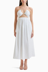 Jayne Dress crafted from the finest cotton fabric presents a classic feminine silhouette. Featuring a plunging V-neckline, cut-out details on the bodice, an adjustable back tie, a mildly flared style skirt with pockets, and an elasticated waistline.