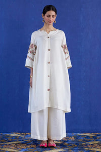 Featuring the White Kaura Co-ord Set by Sarang Kaur from the Patiala Collection. This elegant Chandheri silk ensemble includes a hand-embroidered kurta and palazzos in a relaxed fit, offering a timeless blend of comfort and sophistication for any occasion.