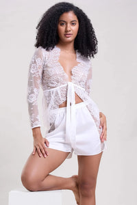 This stunning white Chantilly lace shrug and shorts set is perfect for adding a touch of elegance to your wardrobe. The lightweight lace shrug ties at the front, offering a delicate and chic look, while the high-waisted shorts provide a comfortable and stylish fit. This set is ethically made in our atelier and is finished with our special Mysthelle branded hardware.
