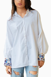 Featuring the classic White Lily Shirt by URAIB from The Colored Castle Collection. Tailored from cotton-poplin fabric, this set boasts a bold and stylish look with its intricate hand embroidered collar & cuffs, ensuring a distinctive wardrobe essential.