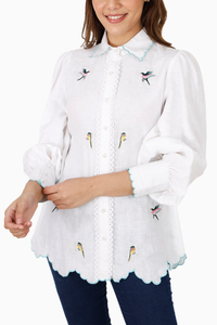 This soft linen shirt evokes an air of effortless sophistication with a hint of playful charm. The white canvas acts as the perfect backdrop for the vibrant medley of birds which are embroidered at the front & back. The scalloped edges elevate the design from ordinary to extraordinary adding depth and dimension to the garment. This exquisite shirt with its feathered inhabitants is a reminder to embrace life's little joys and find beauty in the everyday.