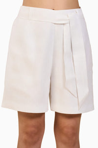 These white shorts are designed with a high-rise waist for a flattering fit. The back waistband is elasticated, providing comfort and flexibility. They feature a concealed zipper on the side seam for a seamless look. There's a pocket on one side for convenience, and loops are included for adding a belt for extra style.