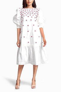 Featuring White Long Dress With Embroidery by Deepika Arora. A long gathered hem dress with cutwork embroidery.