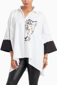 Introducing the White Loose Fit Cotton Poncho Shirt with Foil Print. Made from soft cotton, this regular-fit poncho shirt features a striking foil print that adds a touch of shine to its clean white fabric. With its relaxed, loose fit, this shirt combines comfort and style effortlessly, making it perfect for casual, laid-back looks.