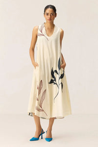 Featuring a classic Khara Kapas silhouette in soft white pure cotton mul, this sleeveless dress showcases a rounded V-neck and practical side pockets. The abstract black and red leaf print adds a bold, modern edge to its minimalist form. Fully lined for comfort and ease.