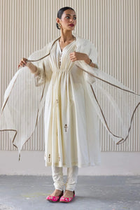 The White Mani Kaftan Suit by Sarang Kaur from the Patiala collection exudes elegance. This hand-embroidered set includes a Chandheri silk kurta, lycra pants, and a luxurious organza silk dupatta, designed for a relaxed fit and timeless sophistication.