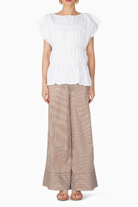 Effortlessly chic and beautifully detailed, this white peplum Marla top is a summer must-have. Crafted from lightweight, crisp cotton, it features a structured, wide smocked waistband that creates a flattering and defined silhouette. The sleeveless design is complemented by a delicate peplum hem, which adds a touch of playful volume and movement. This versatile piece can be dressed up with a skirt or down with your favorite pair of jeans.