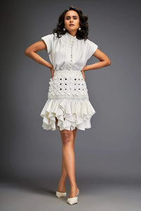 Featuring the White Metallic Silver Ruffle Skirt Set by Deepika Arora's Metallic collection, this co-ord blends a structured blouse with an elegant ruffled skirt. Detailed with silver metallic embroidery, the set is tailored from Rozella Crepe and Vegan Leather for a refined, true-to-size silhouette.