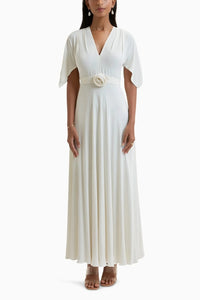 Discover comfort and elegance with the Napoli dress, featuring a flowing silhouette, draped bell-style slit sleeves and delicate pleating on the shoulders. Rose-embellished belt cinches the waist, adding a touch of femininity. With a luxurious inner lining and a V-neck, this fluid dress is perfect for any occasion, ensuring you look effortlessly sophisticated.