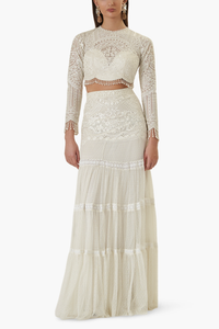 White on white delicately and intricately allover embroidered full-sleeve crop top. Pearl fringes dripping down the cuffs and bottom hem of the top. Hand applied pearls adorn the rounded neck. Hook-eye and zip closure at the back. Paired with flowy tiered tulle maxi-length skirt with delicate white on white embroidery from the high waist till the mid thigh. Tiers of tulle are attached with soft cotton lace inserts. The skirt is elasticated at the waist and has a button and zip closure on the side. The top is lined in the front with removable pad pockets, while the skirt is fully lined.