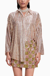 Radiate elegance at your next event in our White & Peach mini skirt, sparkling with vibrant sequins and intricate embellishments. The chic design, complemented by a detailed shirt, ensures you make a standout impression.