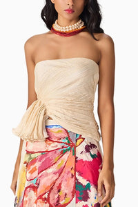 The White Peplum Juliette Blouse features a hand micro-pleated, strapless design with elegant side ruching detail, offering a refined and structured silhouette. Perfect for pairing with high-waisted skirts or trousers for a sophisticated look.