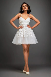 Featuring the White Petal Evening Dress by Deepika Arora's Metallic collection, this graceful white dress is adorned with silver 3D embellishments over a layered tulle skirt. Crafted from Net, Vegan Leather, and Ponte Roma, it offers a true-to-size fit with delicate, ethereal charm.