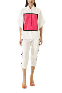 All white cotton co-ord set with hot pink sequence box detailing with short jumper pants.