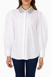White Pintucked Studded Collar Shirt