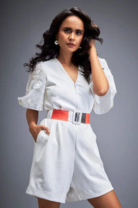 Playsuit with voluminous sleeves and intricate applique detailing, complemented by a bold neon and silver waist belt.
