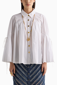 Featuring the White Pleated Shirt by MellowDrama's by Utopia Collection. Crafted from 100% cotton, this voluminous shirt features all-over pleats and a front opening with statement logo buttons. It includes a yoke tie detail and offers a relaxed fit for a blend of sophistication and comfort.