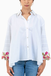 Featuring White Poppy Shirt by URAIB from The Forest Affair, This hand embellished shirt in cotton poplin is designed for glamourous am-to-pm days, making you look stylish at work and the relaxed fit is charming.