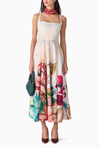 Featuring White Prime Neva Dress by Saaksha & Kinni's Nirah Collection. This chic midi dress showcases a square neckline, a fitted bodice, and a striking abstract floral print placement, blending elegance with modern sophistication.