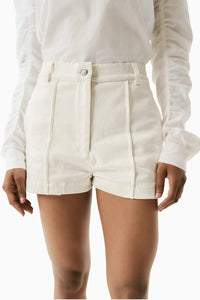 Featuring the White Promenade Shorts by OSHIN's SS'25 collection. These mid-thigh length shorts showcase a high waist, front fly closure, front and back pleat details, front side pockets, and a back patch pocket for a polished yet casual look.