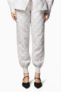 Featuring White Quilted Joggers by Mellow Drama from their A/W'24 Collection - Catalyst. Experience comfort in style with these 100% Cotton joggers. The smocked bottom hem, side zipper, and high-waisted fit redefine casual elegance.