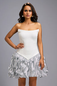 A strapless white knee-length dress with a structured bodice that flatters the figure. The voluminous ruched shimmer embroidered bottom adds graceful movement and shimmer, ideal for elegant parties and celebrations.
