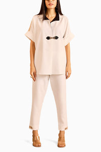 A luxury crepe co-ord set with beige tape detailing, a contrast black collar and buckles.