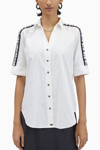 It's glamorous. It's elegant. It's our white rectangle swarovski ribbon shirt. Since we all need that signature white shirt, here's yours with some elegant rectangle swarovski stones embellished on a contrasting ribbon on the shoulder.