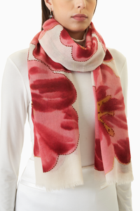 Our collection of Shawls in 100% Merino Wool for modern and resourceful women. The entirely hand-painted floral scarf is characterized by a size of 80 x 180 cm and katha style embroidery details making the stole truely one of a kind. Perfect to be wrapped around the neck and wear it in a casual and contemporary way.