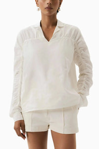 Featuring the White Ripple Shirt by OSHIN's SS'25 collection. This relaxed-fit piece showcases a notched collar, shoulder-to-arm ruching detail, regular cuffs, and a flattering high-to-low hem—perfect for effortless everyday elegance with a modern twist.