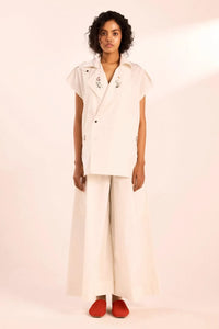 An all-white poplin co-ord set featuring a tunic with a notch lapel, delicate embroidery, and front button opening, along with pockets. The flared pants include flap pockets for added style and functionality.
