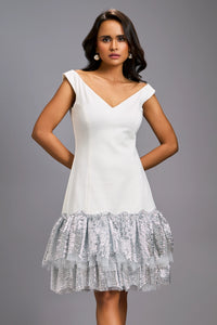 An elegant off-shoulder white dress featuring a V-neck and a flared silhouette. The layered silver shimmer ruffles at the hem bring a graceful shimmer and playful volume, ideal for special celebrations and upscale gatherings.