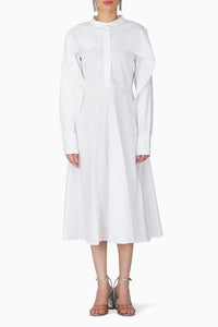 The Sabi Dress is a striking blend of classic and modern style. This pristine white dress features a unique high neckline and a button-down bodice that adds a touch of sophistication. A dramatic, cape-like overlay drapes elegantly over the shoulders and down the back, creating a sculptural silhouette. The long sleeves are finished with refined buttoned cuffs, while the flowy skirt provides a graceful finish. This is a truly unique dress for those who want to make a subtle, yet powerful statement.