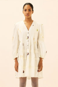 A white dress featuring delicate pintucks, gathered detailing, a V-neckline, and a row of buttons for a charming, handcrafted look.