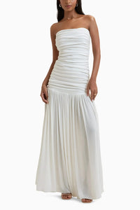 The Sandro maxi gown presents a stunning fit-and-flare silhouette, crafted from stretch cotton for a flattering and snug fit. This gown features elegant gather detailing on the bodice, a dramatic pleated chiffon skirt, an off-shoulder cut, and a side zip closure.