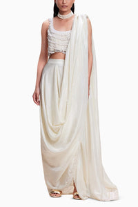 Unveil your inner elegance with Kangana Trehan’s white blouse, adorned with crystalized tassel embroidery, paired with a semi-stitched saree. This masterpiece blends contemporary style with classic feminine grace, featuring rich materials and intricate details to enhance your timeless beauty.