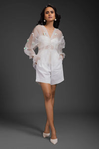 Featuring White Sheer Organza Neon Top by Deepika Arora. A delicate sheer organza shirt accented with vibrant neon details, combining soft elegance with a bold, contemporary edge. Perfect for making a fresh, stylish statement.