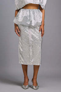 A sleek white midi skirt embellished with shimmer embroidery. The design delivers a clean, elegant look with a touch of shimmer, perfect for celebrations and chic events.
