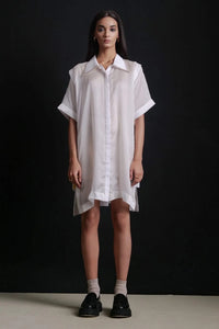 The Side Fun Dress from Mo by Meet features luxurious white satin silk, adorned with golden and off-white patchwork and embroidery on the collar. The elegant detailing adds a refined, artistic touch, making this set a perfect choice for sophisticated, standout style.