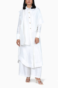 Featuring White Silk Maxi Scarf Set by 431-88 Shweta Kapur from The Popsicle Collection. Radiate elegance with this stylish comes with a front panel extending into a scarf that drapes around your neck. Maxi Scarf Set features a relaxed fit scarf dress with wide trousers. Crafted in silk fabric, this dress is made in a mid calf length and has full sleeves. Comes with matching trousers for a coordinated look.
