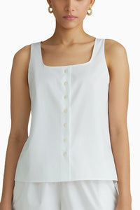The sleeveless cotton top in white is crafted from 100% Egyptian Giza Cotton with a 120/2 thread count, featuring mother-of-pearl buttons, a square-round neckline, and a subtle A-line shape with small side slits, offering an effortlessly refined and elegant silhouette.
