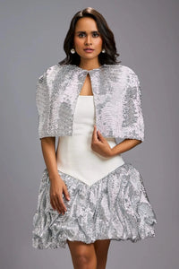 A strapless white knee-length dress with a voluminous ruched shimmer embroidered bottom. The dramatic cape detail adds elegance and movement, ideal for special celebrations and formal affairs.