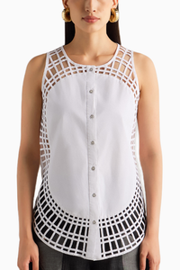 Featuring the White Sunray Shirt by MellowDrama's by Utopia Collection. Crafted from 100% cotton, this sleeveless shirt features a front opening with buttons and a handmade sunray weave panel at the front. It offers a regular fit, combining casual comfort with artisanal detailing for a distinctive look.