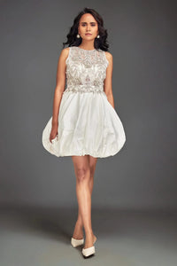 Featuring White Swaroski Embellished Dress by Deepika Aroras Swaroski Collection, this exquisite dress showcases a sheer mesh bodice adorned with intricate beaded floral embellishments and a voluminous puffed balloon skirt, radiating timeless elegance and playful sophistication.