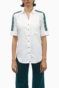 Give your classic white shirt an elegant spin-off with the luxurious emerald-hued swarovski stones that are bound to catch your eyeballs whenever you slip into this beauty. You need this statement crisp white shirt, crafted from fine cotton satin, in your closet to glam up your look now and then.